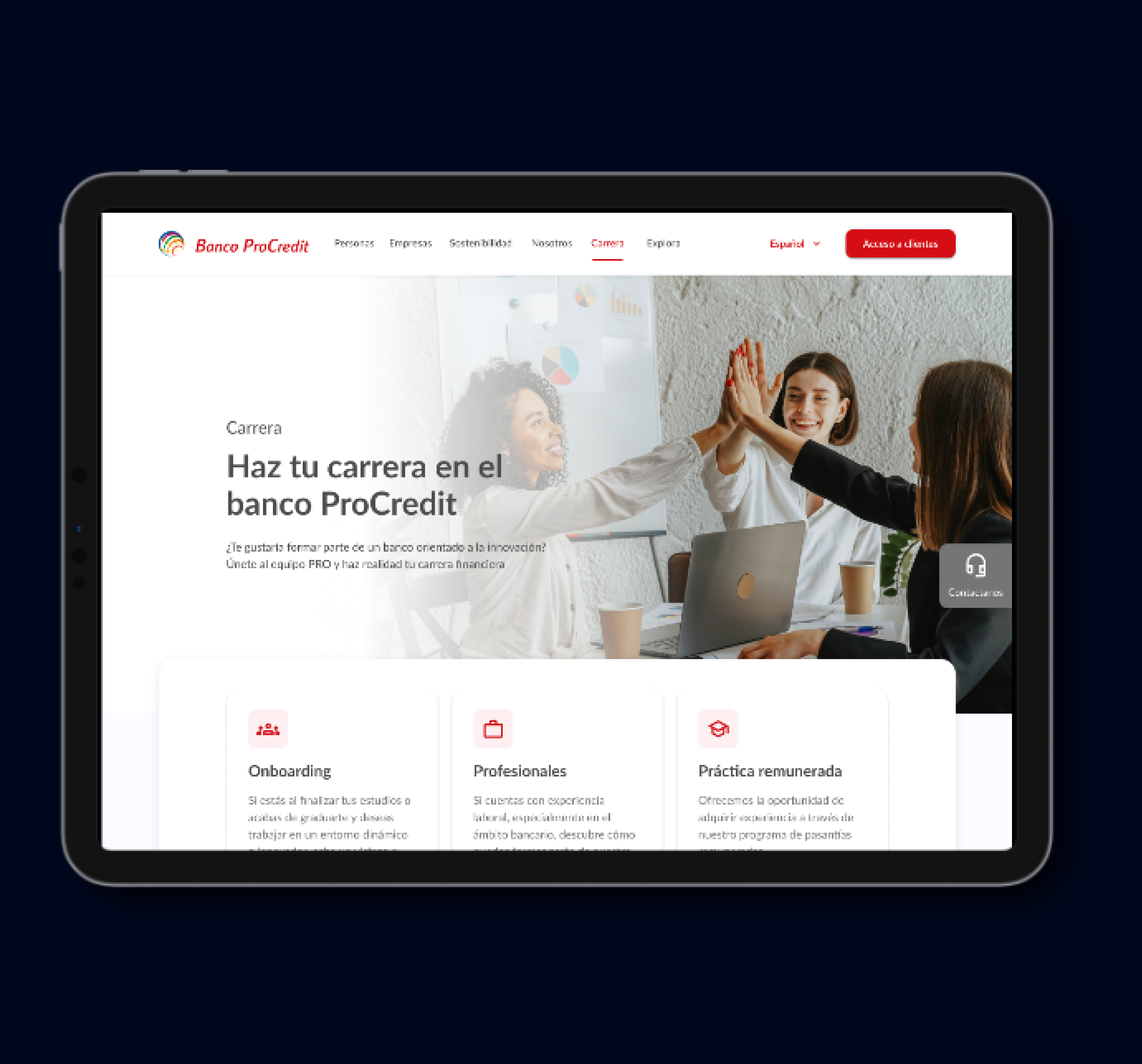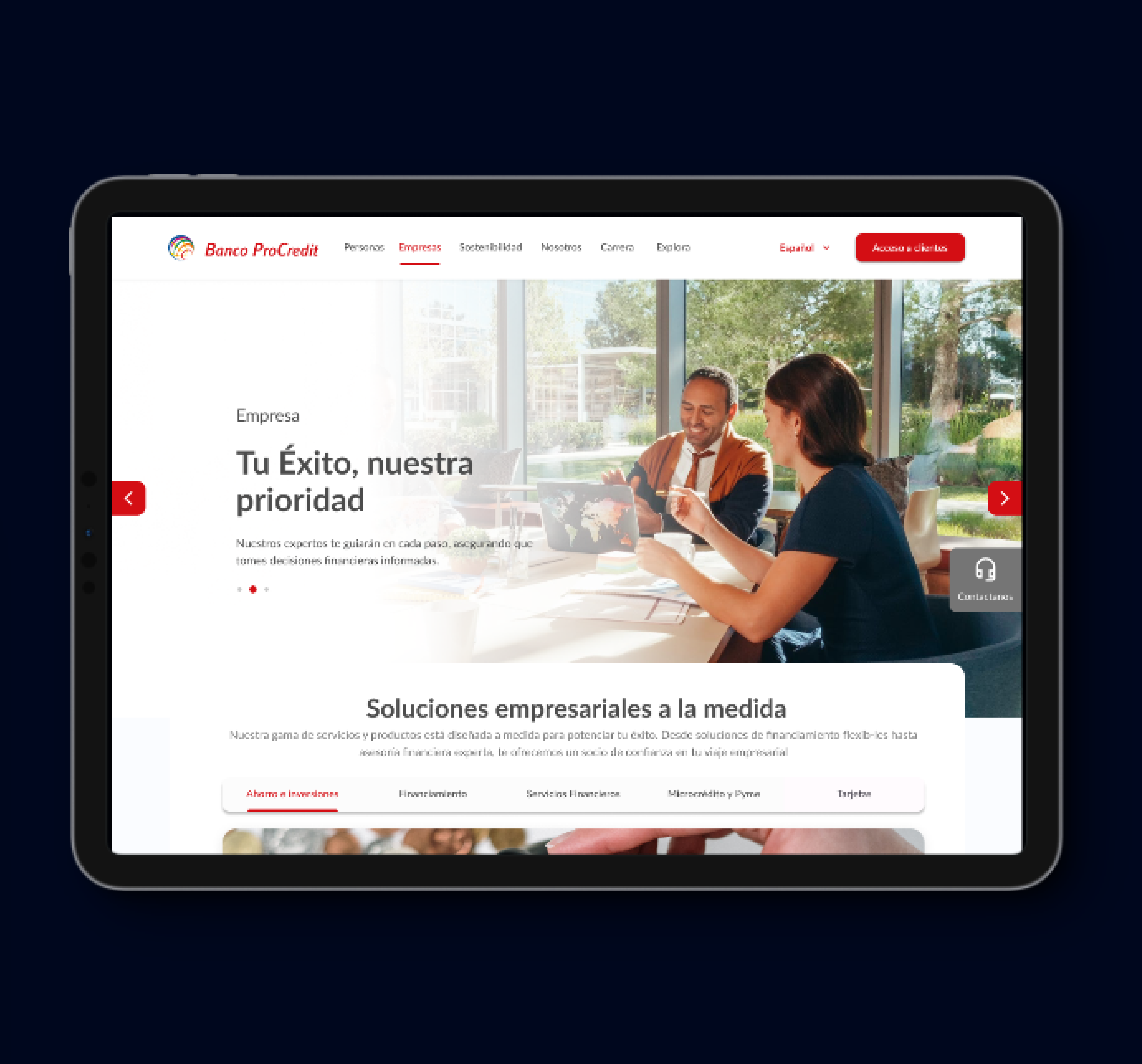 The solution leverages ProCredit Bank’s existing visual identity to streamline the website redesign. By aligning interface elements with the mobile app and applying responsive design, we ensure a cohesive brand presence and seamless user experience across all devices.